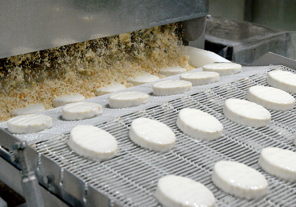 バッター付けから流れてきた中具にパン粉が付けられます。
